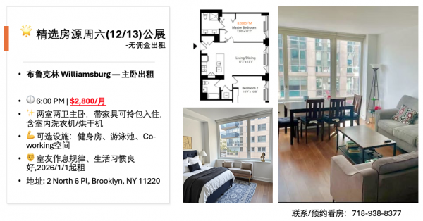 纽约布鲁克林 Williamsburg|两室两卫主卧出租 $2,800/月
